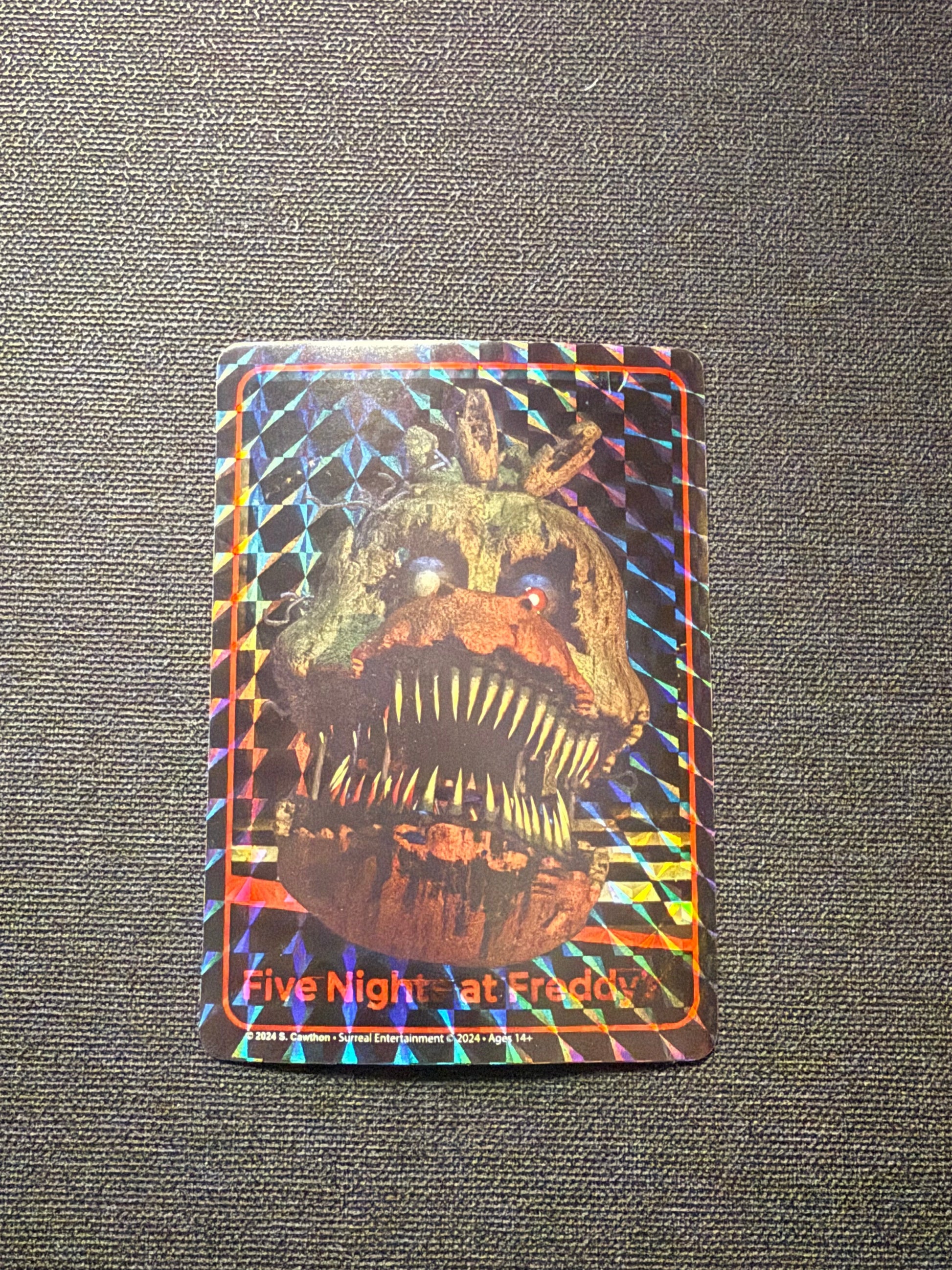 Holographic trading sticker from UCC's official Five Nights at Freddy's blind-pack series. Design: Five Nights At Freddy's Nightmare Chica.