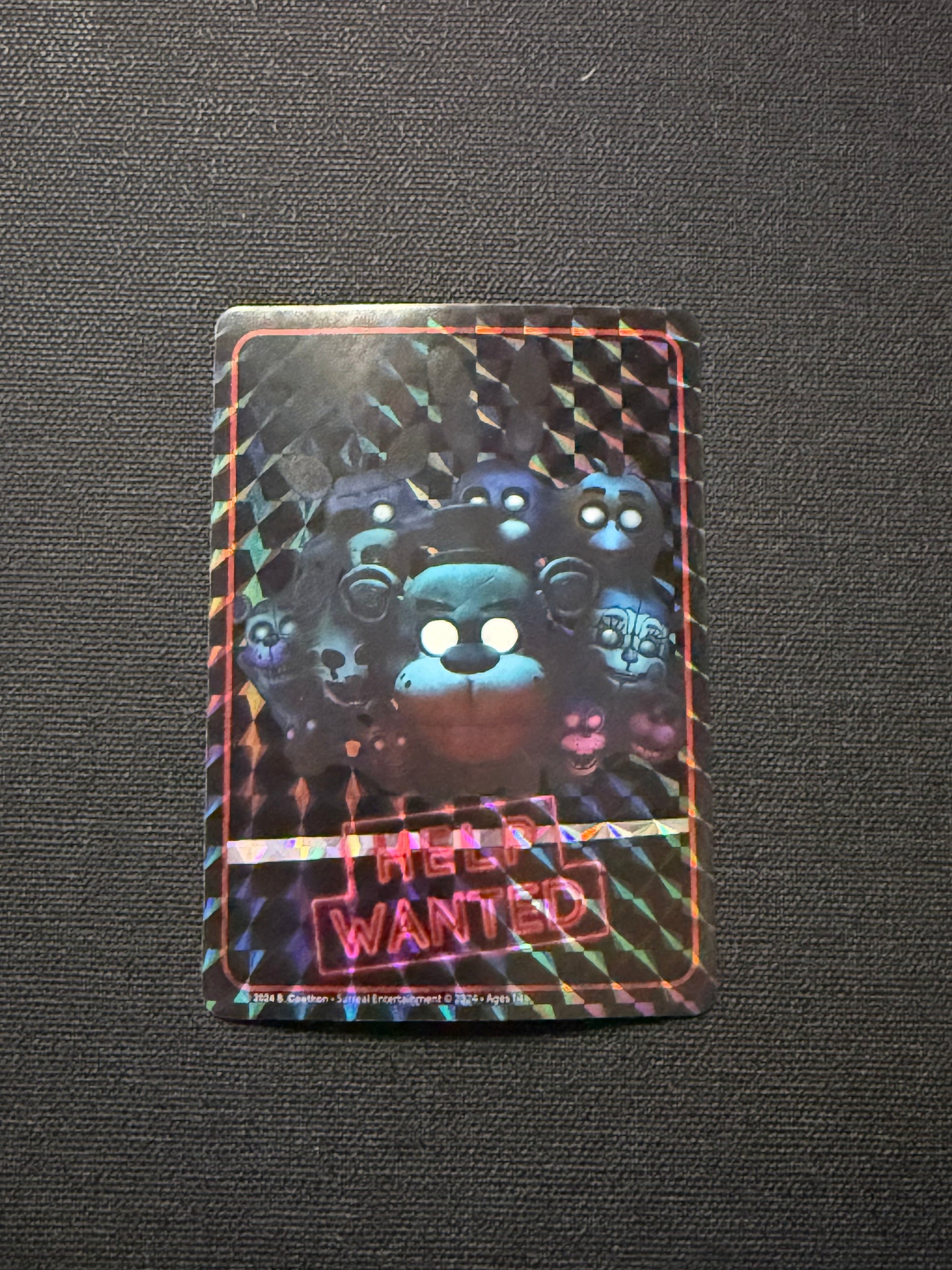Holographic trading sticker from UCC's official Five Nights at Freddy's blind-pack series. Design: Help Wanted Poster.