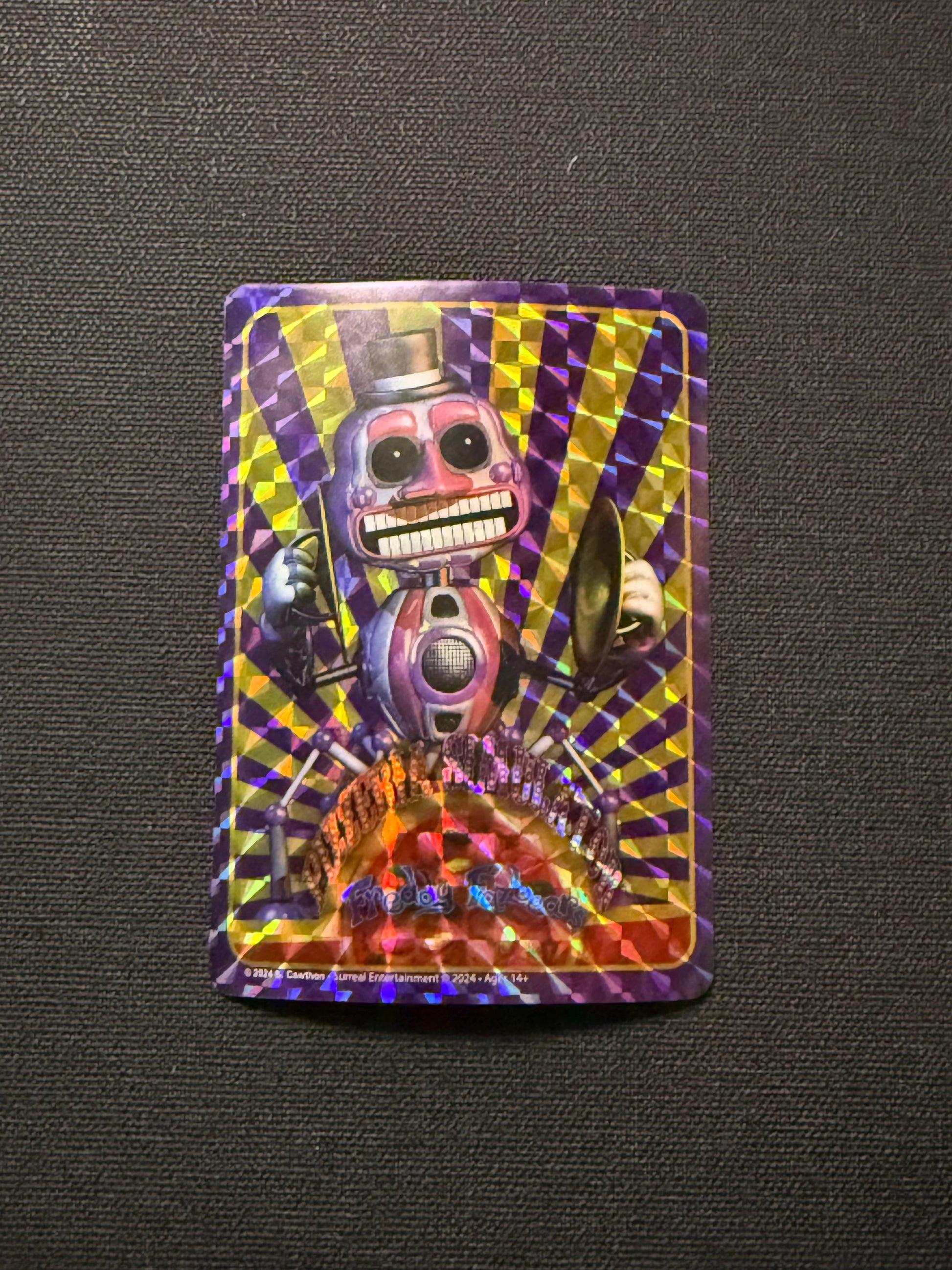 Holographic trading sticker from UCC's official Five Nights at Freddy's blind-pack series. Design: Pizzaria Sim Music Man.